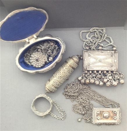 Lotto composto da due collane etniche lunghe di cui una con campanelle, una scatola contenente pezzi di bigiotteria e un bracciale lavorato a filigrana uniti a una mezuzà, tutto in metallo o metalloargentato
