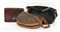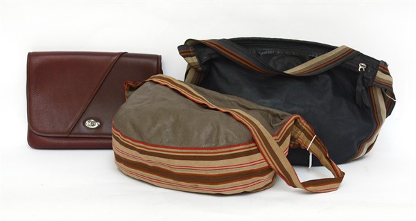 Lotto composto da una pochette in pelle martellata bordeaux e due borse capienti a tracolla in tela (difetti e segni d'uso)