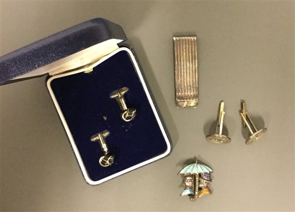 Lotto composto da due paia di gemelli di cui uno in argento, entrambi in confezione originale, un fermasoldi in argento e una spilla in metallo color argento e smalti (difetti e segni d'uso)