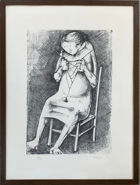 Lotto di due litografie: una firmata Consesso raffigurante una donna che lavora
