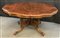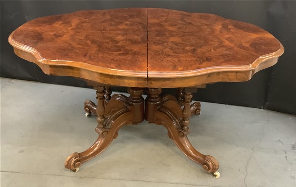Tavolo da centro allungabile con piano sagomato e radicato sostegno e colonne tornite, quattro gambe sagomate. Munito di prolunga, Inghilterra secolo XIX (difetti)