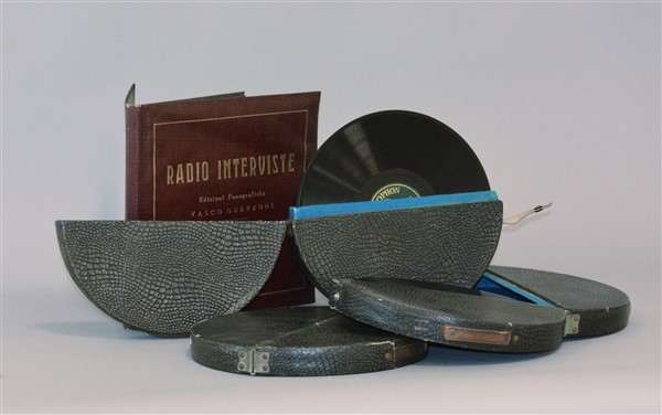 Cartone contenente un raccoglitore con vinili 33 giri e tre contenitori di forma circolare con vinili 33 giri (difetti)