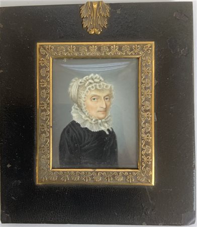 Scuola del secolo XIX "Ritratto di dama con cuffia bianca" miniatura su avorio (cm 6x5) In cornice