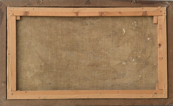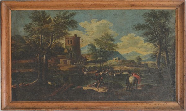 Ignoto del XIX / XX Secolo "Paesaggio con torre" olio su tela (cm 61x106) In co
