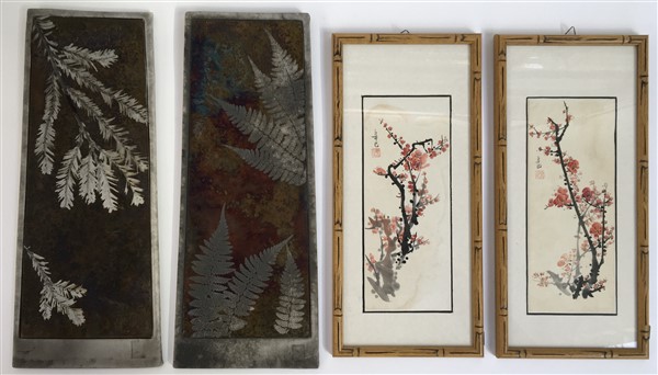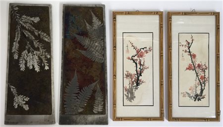 Lotto composto da quattro stampe orientali su seta raffiguranti fiori e due acquerelli con rami di ciliegio, in cornici, uniti a una coppia di pannelli in ceramica e metallo acidato raffiguranti felci e rami di conifere, misure differenti (difetti)
