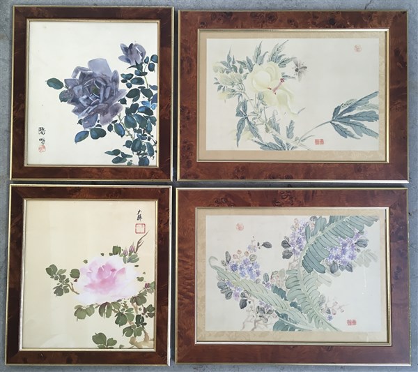 Lotto composto da quattro stampe orientali su seta raffiguranti fiori e due acq