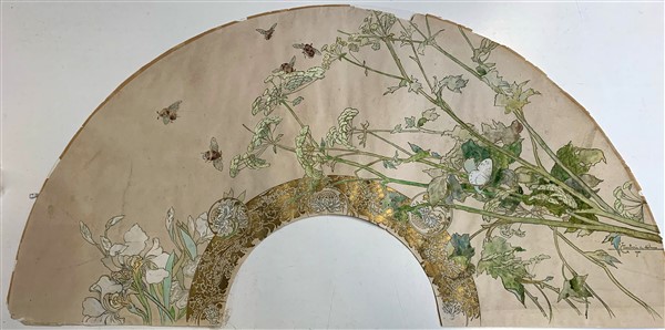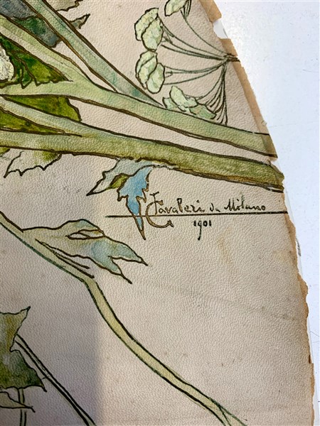 Lotto composto da una tecnica mista di Lodovico Cavaleri (Milano 1867 - Cuvio 1942) eseguita per pagina di ventaglio firmata, locata Milano e datata 1901 (cm 35x68); unito a due stampe raffiguranti episodi delle Cinque Giornate di Milano (difetti)
