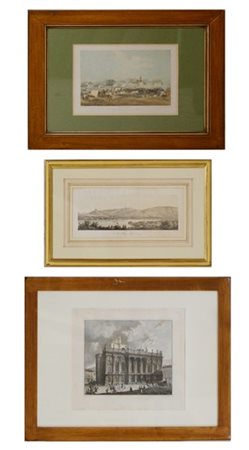 Gruppo di tre diverse incisioni raffiguranti "Scorcio di Ginevra", "Campo dei cacciatori d'Africa a Novara" e Palazzo Madama da Giovanni Migliara (misure diverse) In cornici (difetti)