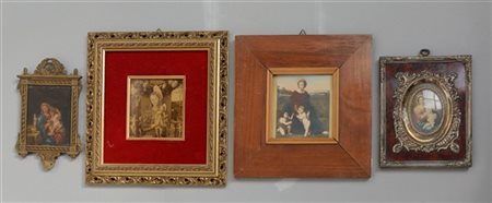 Lotto composto da due miniature e due riproduzioni su carta raffiguranti Madonna con Bambino, in cornici (h max cm 9,5) (difetti)