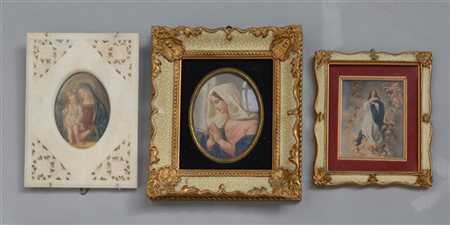 Lotto di tre miniature su avoriolina raffiguranti la Vergine orante e l'Immacolata tra gli angeli entro cornici in legno, e la Madonna con Bambino entro cornice in alabastro traforato (h max cm 11) (difetti)