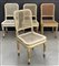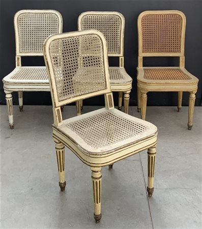 Lotto composto da nove sedie di simil decoro in legno laccato con profili ocra e dorati, secolo XIX (difetti e restauri)