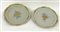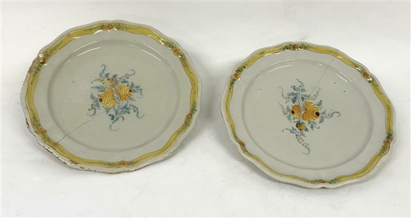 Coppia di piatti a bordo mistilineo in maiolica decorata in policromia a motivi floreali (d. cm 34,5) (difetti e mancanze)