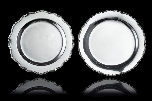 Lotto composto da due piatti da portata di diverse misure in argento liscio a bordo mistilineo e scanalato. Titolo 800. Argentieri differenti (d. max cm 29) (g 870)