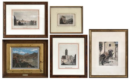 Lotto composto da cinque stampe a colori e colorate a mano, soggetti, epoche e