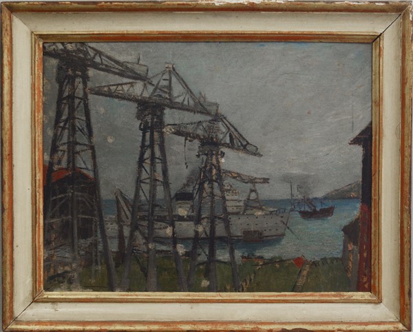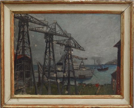 Maestro del XX Secolo "Cantiere navale" olio su compensato (cm 57x75) In cornic