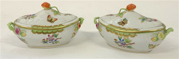 Manifattrura di Herend, coppia di piccole zuppiere biansate in porcellana decor