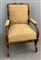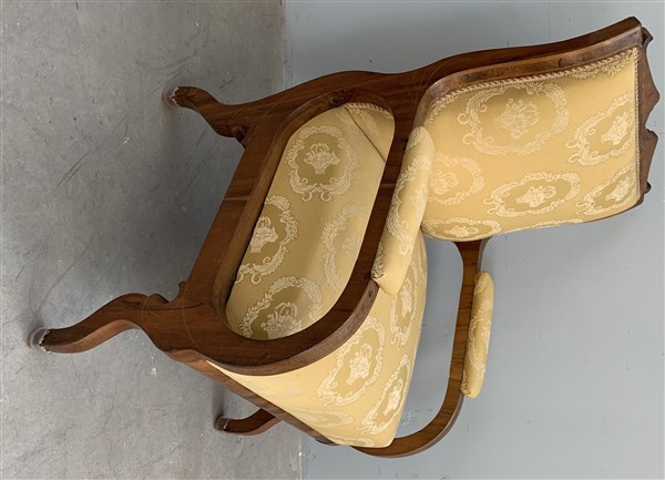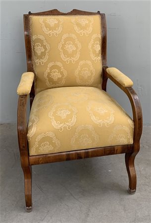 Poltrona in noce e radica di noce di forma mossa con rivestimenti in tessuto operato giallo. Secolo XIX (difetti)