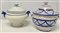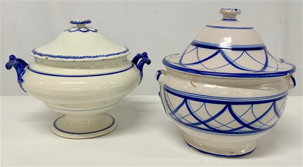 Manifatture diverse. Due zuppiere biansate con coperchio in ceramica decorata nei toni del blu su fondo bianco (difetti)
