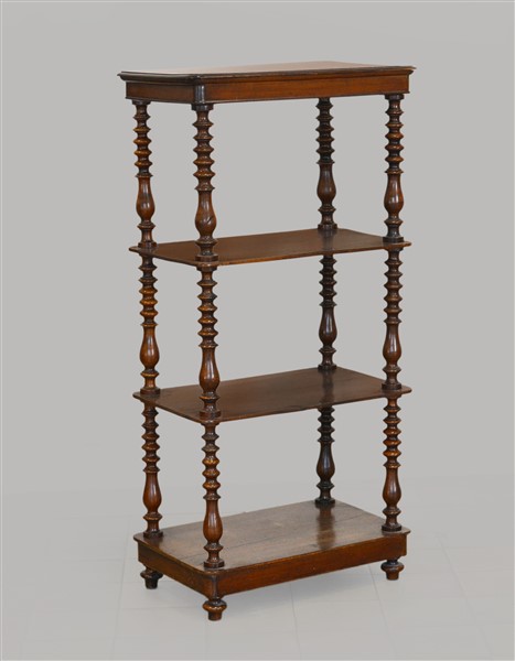 Etagere in noce a quattro ripiani sorretti da montanti torniti, secolo XIX (cm 59x122x36) (difetti)