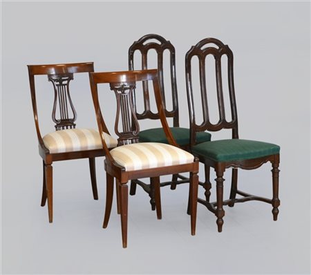 Lotto composto da una coppia di sedie a gondola con schienale a lira ed una coppia con schienale a listelli e gambe anteriori tornite (difetti)