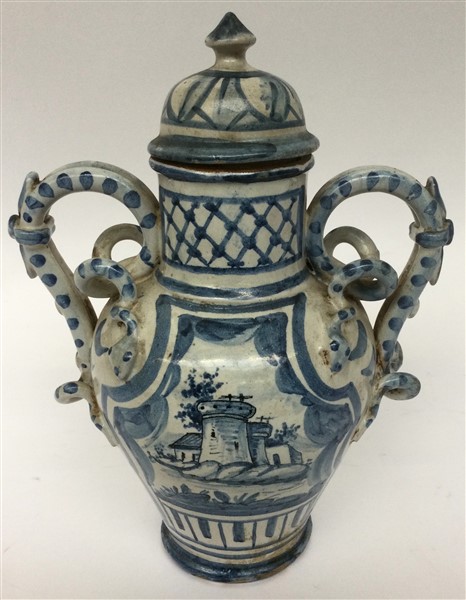 Manifattura ligure, vaso biansato con coperchio in maiolica decorato con fregi e paesaggio in monocromia blu, anse a forma di serpenti (h cm 27) (difetti)