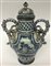 Manifattura ligure, vaso biansato con coperchio in maiolica decorato con fregi