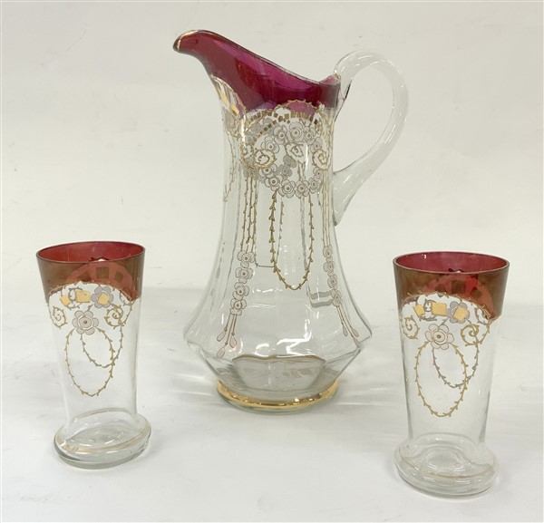 Set da bibita composto da caraffa e due bicchieri in vetro decorati a ghirlande dorate (lievi difetti)