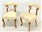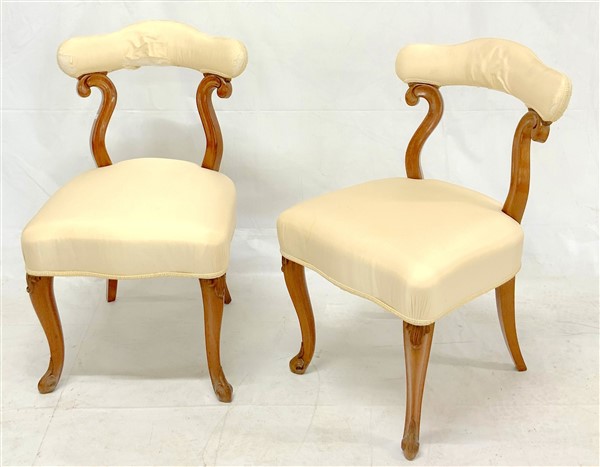 Coppia di sedie in legno intagliato, schienale a giorno, gambe anteriori mosse. Seduta e schienale rivestiti in tessuto color avorio (difetti)