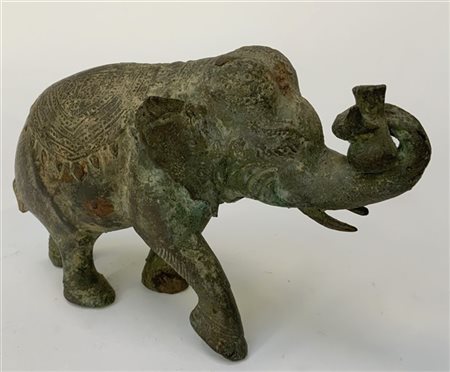 Manifattura orientale, elefante in bronzo a patina verde (difetti) (h. 11 cm.)
