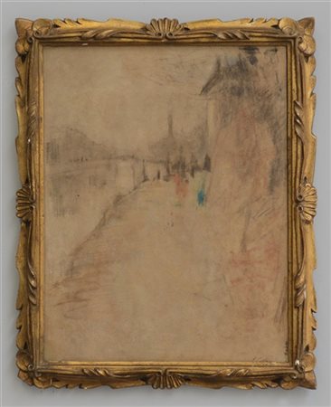 Emilio Gola "Milano, Naviglio" tecnica mista su carta applicata a tela (cm 45x34
