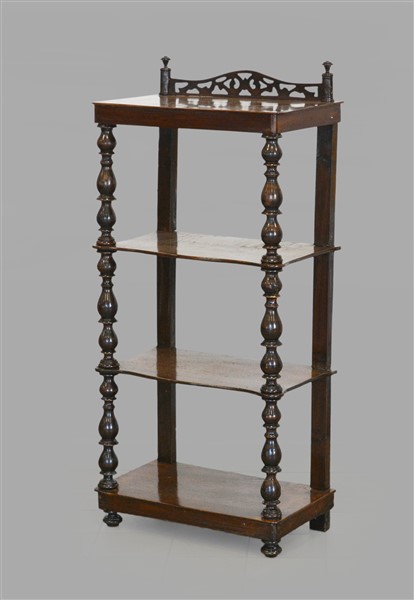 Etagere in noce a quattro ripiani, montanti anteriori torniti, pianetto superiore decorato da alzatina traforata, secolo XIX (cm 57x125x32) (difetti)