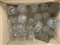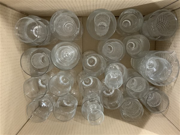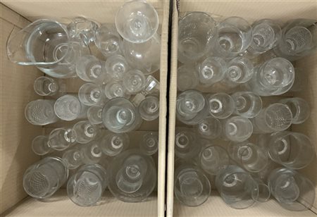 Tre cartoni contenenti numerosi bicchieri e alcune caraffe in cristallo di fatture differenti (difetti)