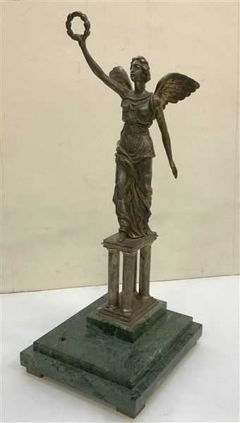 Ignoto "La Dea Vittoria" scultura in metallo argentato poggiante su una struttura architettonica con colonne scanalate. Base in marmo verde (h cm 71) (difetti e mancanze)