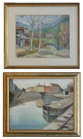 Lotto composto da due dipinti a olio, uno su tela e uno su carta, raffiguranti paesaggi, di autori, tecniche e misure diverse