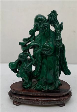 Figura rappresentante Shoulao in malachite (h. cm 14) Su base lignea. Cina, sec