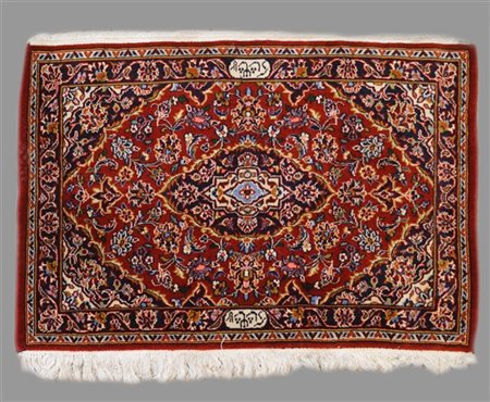 Tappeto Keshan, Persia, secolo XX. Decoro con medaglione blu su fondo rosso e due cartigli con iscrizione in lingua islamica (cm 97x67) (Lievi difetti)