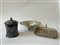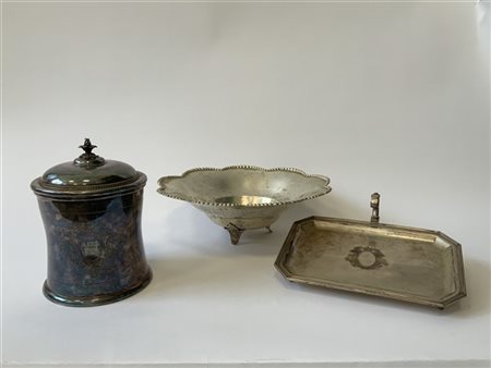 Lotto composto da un centrotavola a bordo mosso e perlinato, un vassoietto ottagonale e un barattolo con coperchio in argento (g 1100) (difetti)