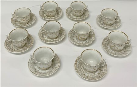 Manifattura Ginori. Dieci tazzine con piattino in porcellana bianca e decoro in oro (difetti)