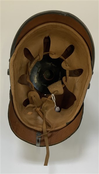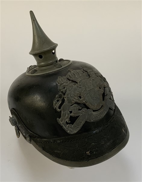 Pickelhaube da truppa di fanteria modello 1915, in cuoio bollito con metalleria in ferro dipinto. Interno perfettamente conservato, ma probabilmente da magazzino miltare. Mancante del soggolo e delle rosette della Baviera e del Reich (h. cm 23) (lievi difetti)