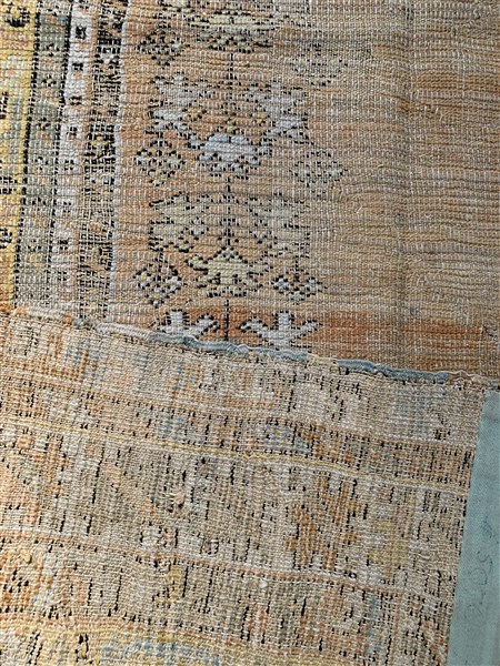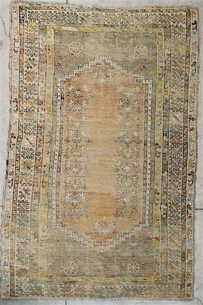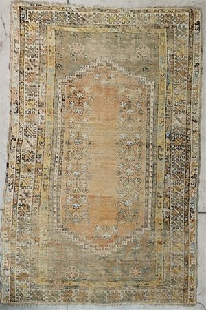 Tappeto Kirscheir, Anatolia, secolo XIX. Decoro a doppia nicchia color camoscio nei toni del camoscio, verde e giallo. (gravi difetti, rapature, mancanze) (cm 180x116)