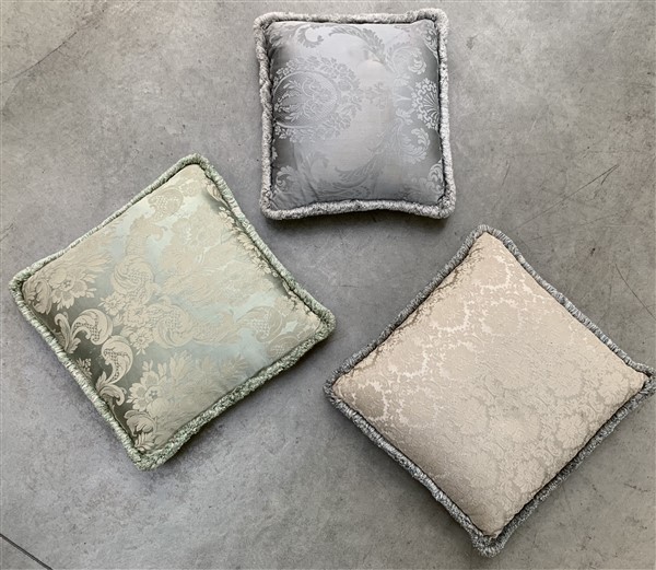 Lotto di tre cuscini confezionati con tessuto damasco in seta nei toni del verd