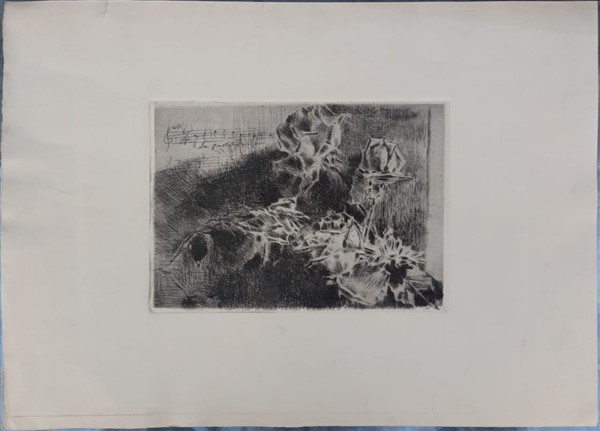 "Rose" acquaforte (foglio cm 36x49, battuta cm 18x25,5) firmato e datato '80 in lastra in alto a destra