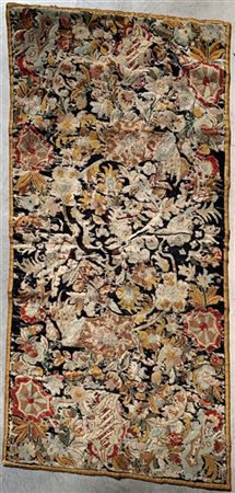 Tappeto piccolo punto, Francia, 1835 circa. Decoro di stile bizarre su fondo marrone (cm 142x68) (difetti e rapature)