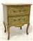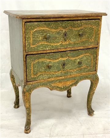 Comodino in legno laccato, piano a finto marmo, due cassetti pannellati, gambe di forma mossa (cm 57x72x35) (difetti)