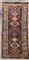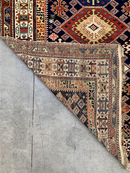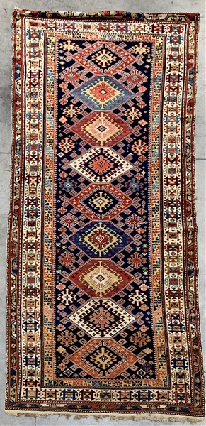 Tappeto Shirwan, Caucaso, inizi del secolo XX. Decoro con nove Memling Gül in sequenza su fondo blu notte (cm 271x121) (lievi difetti)