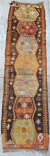 Tappeto passatoia Kilim, Anatolia, secolo XX. Decoro con sette esagoni di differenti colori su fondo marrone (cm 353x92) (difetti)