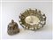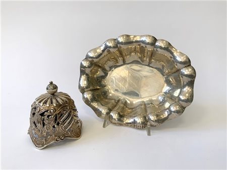 Lotto composto da un campanello traforato a fiori e volute con punzoni inglesi ed un vassoietto in argento sbalzato e martellato a bordo mistilineo (l. vassoio cm 20