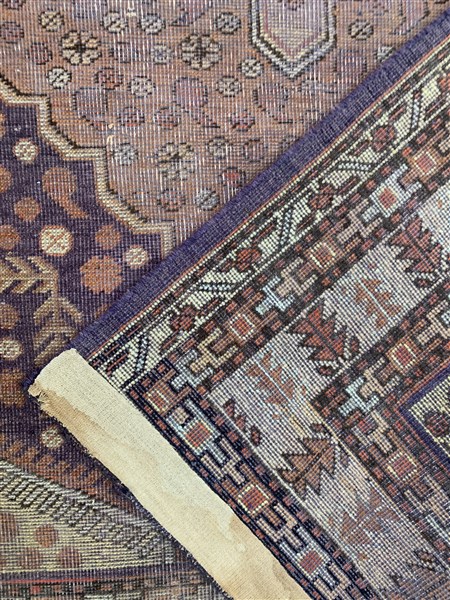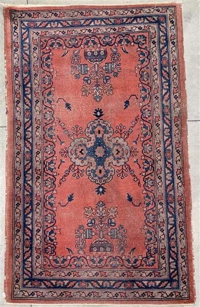 Tappeto orientale, secolo XX. Decoro a medaglione e vasi fioriti su fondo rosa (Difetti, mancanze e rapature)(cm 151x90)