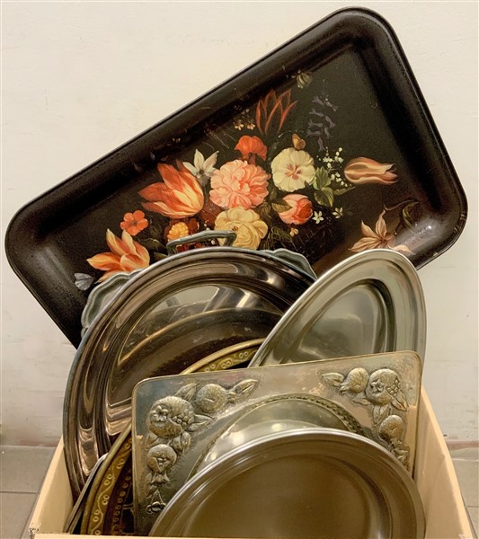 Cartone contenente numerosi vassoi in metallo di fatture ed epoche differenti (difetti)