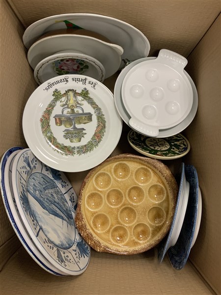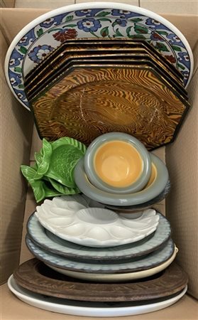Lotto di due cartoni contenenti numerosi piatti e oggetti per la tavola in cera